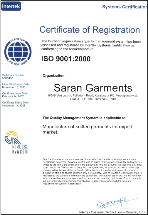 Founded in 1988, the success of Saran Garments, with an attractive sales turnover yearly, is attributed to two basic principles: total commitment to customers and the ability to perceive and respond to rapid changes and demands of the garment industry. Since its humble inception with only a few workers, Saran Garments has grown into a strong and dynamic exporter of knitted garments. Today it is proud to have lot of employees with an annual turnover of US$ 5.00 Million. We as a manufacturer of export quality garments, fulfill the promises of quality and service assuring excellence at every job level. Gaining the reputation to satisfy the requirements and needs of customers, we expertise to provide a wide range of products to customers worldwide..... Founded in 1988, the success of Saran Garments, with an attractive sales turnover yearly, is attributed to two basic principles: total commitment to customers and the ability to perceive and respond to rapid changes and demands of the garment industry.Since its humble inception with only a few workers, Saran Garments has grown into a strong and dynamic exporter of knitted garments. Today it is proud to have lot of employees with an annual turnover of US$ 6.00 Million. Click here to see our profile.We as a manufacturer of export quality garments, fulfill the promises of quality and service assuring excellence at every job level. Gaining the reputation to satisfy the requirements and needs of customers, we expertise to provide a wide range of products to customers worldwide. We are a supplier for all leading chain stores like Walmart, JC Penny U.S.A., Lasenza, Hudson Bay, Sears, Zellers, Reitmens in North America and Tesco, BHS, Arcadia groups in Europe, etc., We are now in the process of broadening the existing clientele establishing vital links with major international markets. We work with our customers from the conceptual stage. Our seasonal staff with years of experience in the industry can provide you with information on product reliability and safety concerns. Our factory is approved for JC PENNEY, Walmart, Hutsonbay productions and for the production of Disney products in North America and Tesco, Woolworth, Arcadia groups in EU. We pay special attention to standards of quality in our manufacture, as we believe that real quality is what customer wants.The quality of products and services we offer are the most important factors for our success. Our activities always place the highest importance in raising the quality of products and services, providing the best for our customers. The achievement of the ISO 9001:2000 standard implies that Saran Garments has increased its productivity at lower operating costs. Everything has become more systematic. Much time and human efforts have been saved for improved services and product quality. ISO certification also enables Saran Garments to win reputation for reliability among clients.If you are looking for particular products, or if you have a product that you would like to develop, please feel free to Contact us today. Our experienced representative will be glad to serve you with all your sourcing and production needs. |